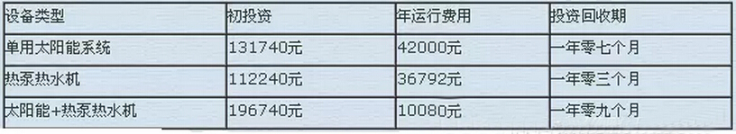 日照充足的時候用太陽能,日照不足的使用使用熱泵輔助加熱,兩套系統(tǒng)相結(jié)合,所需要的工程費用為84500+65000+47240=196740元